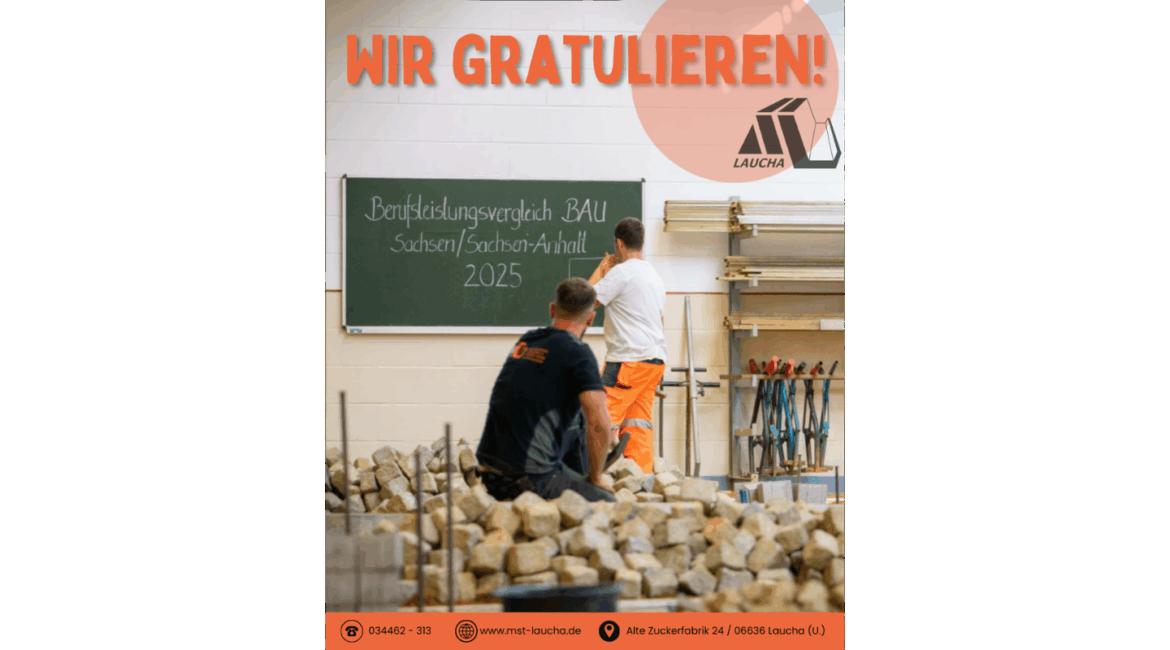… unserem Azubi Peter zur Spitzenleistung beim Berufsleistungsvergleich in Glauchau! 🥳👏🏼Vom 17.08. bis 19.08. hat Peter im Rahmen seiner überbetrieblichen Ausbildung am ÜAZ Holleben am Wettbewerb teilgenommen. Nach 3 spannenden Tagen verpasste er knapp das Treppchen und belegte den Wettkampfplatz 4.🏅Damit zählt er zu den besten Straßenbau-Azubis seines Jahrgangs in...